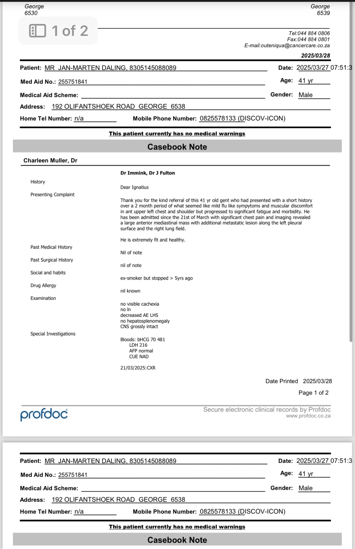 - March 28 - Dr Muller Consultation - Detailed clinical assessment